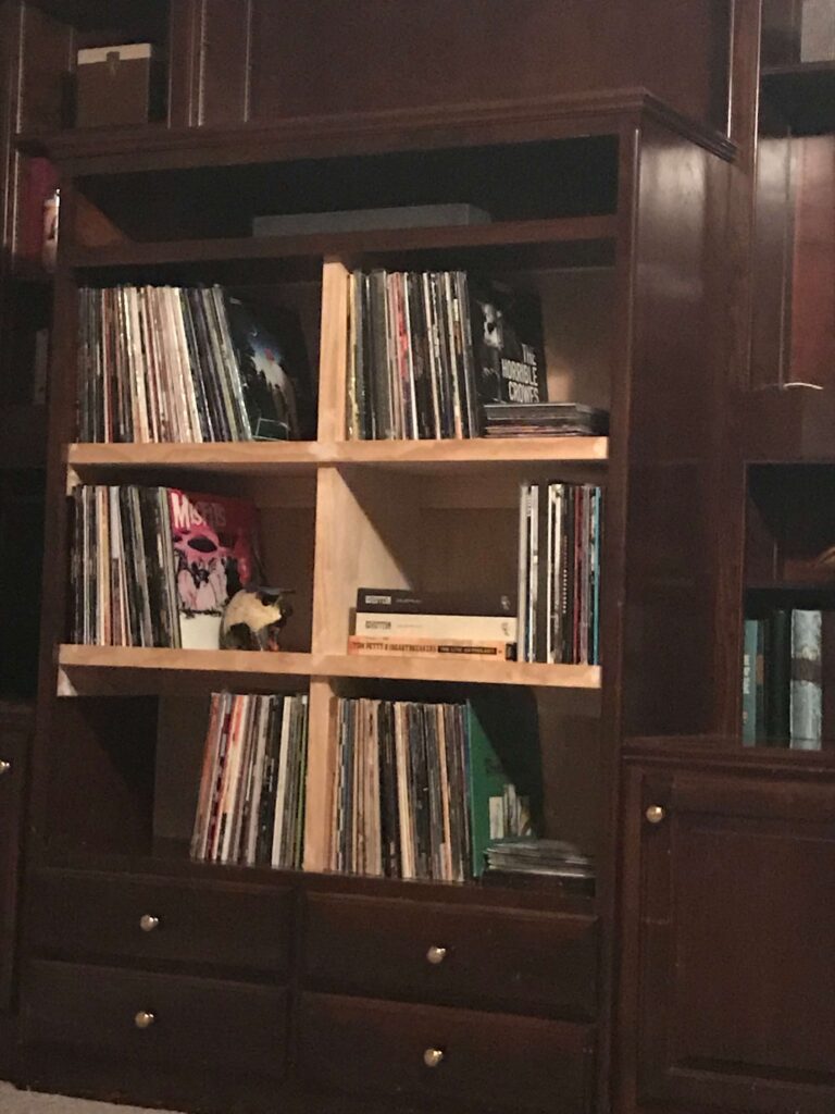 After sitting with the room for a couple weeks, I decided the best solution for the TV cavity would be to create shelving for my record collection. Since the space was originally built for a big TV, it was too deep as is for records. As a solution, we installed a false wall with a sheet of wood, and then created 3 rows of 2 boxes, for a total of 6 cubbies. It was more than enough space for my current collection to grow, and would allow for it to be a prominent feature in the room.