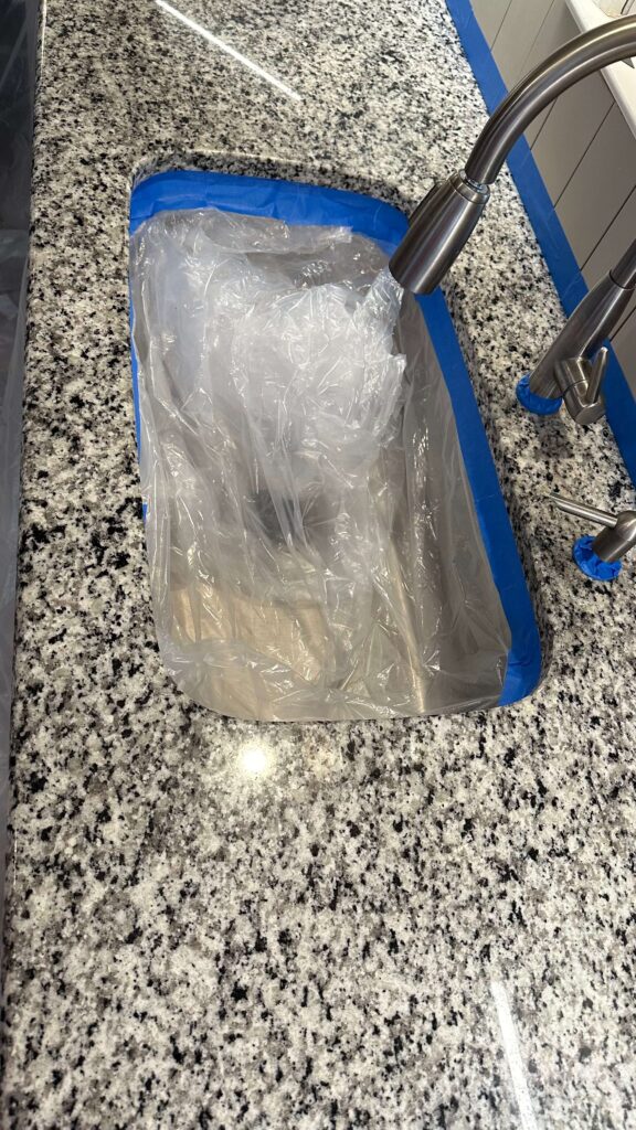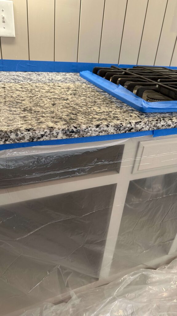 The Giani Marble Countertop Kit came with everything I needed for this flip, including very thorough instructions. To start, they recommend you clean your counters with dish detergent and warm water. I went a step further an also cleaned with a lacquer thinner just to really make sure my granite counters were fully clear of all the dirt, grim and grease. After that, it was time to tape off the new backsplash, as well as the cooktop, sink, dishwasher and lower cabinets. The kit came with all the plastic needed for this, I just had to supply the painter’s tape and then I added extra drop cloths on the floor just to be safe.