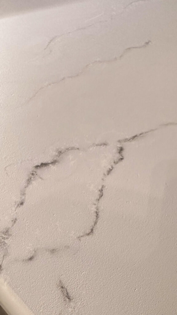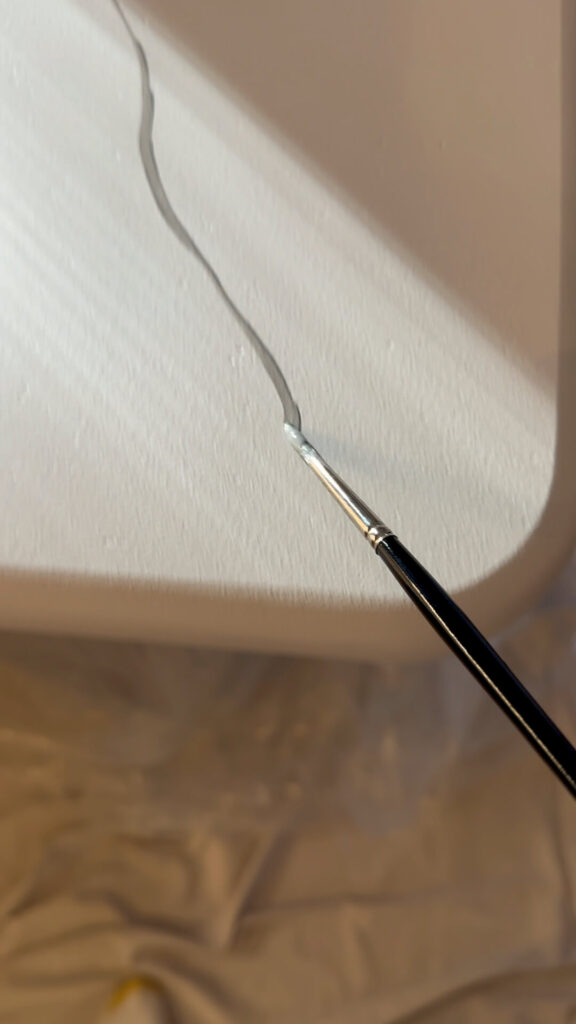 To create a vein, dip the artists brush into the grey paint and lightly drag the tip of it across the countertop. While you drag it, twist it gently in your finger tips to create a more natural looking movement to the line. After painting the line, hold the water bottle a foot away from the line and spray. You’ll see the paint start to feather and bleed, making it fainter and more realistic looking.