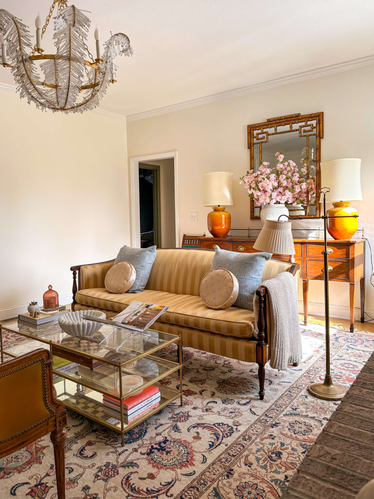 Chandelier | Mantel Artwork | Coffee Table (similar) | Mirror | White Shell Jar | Pink Cherry Blossoms | Curtains | Blue pillows | Peacock Fireplace Fan | Design Coffee Table Books | Rose Candle Cloche | Marble Ribbon Bowl