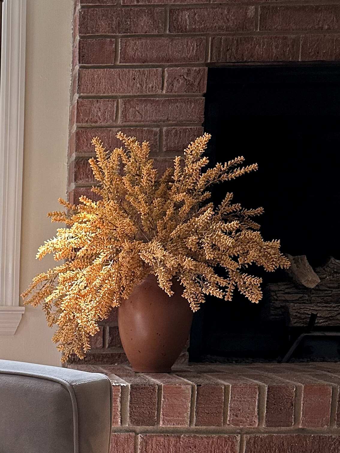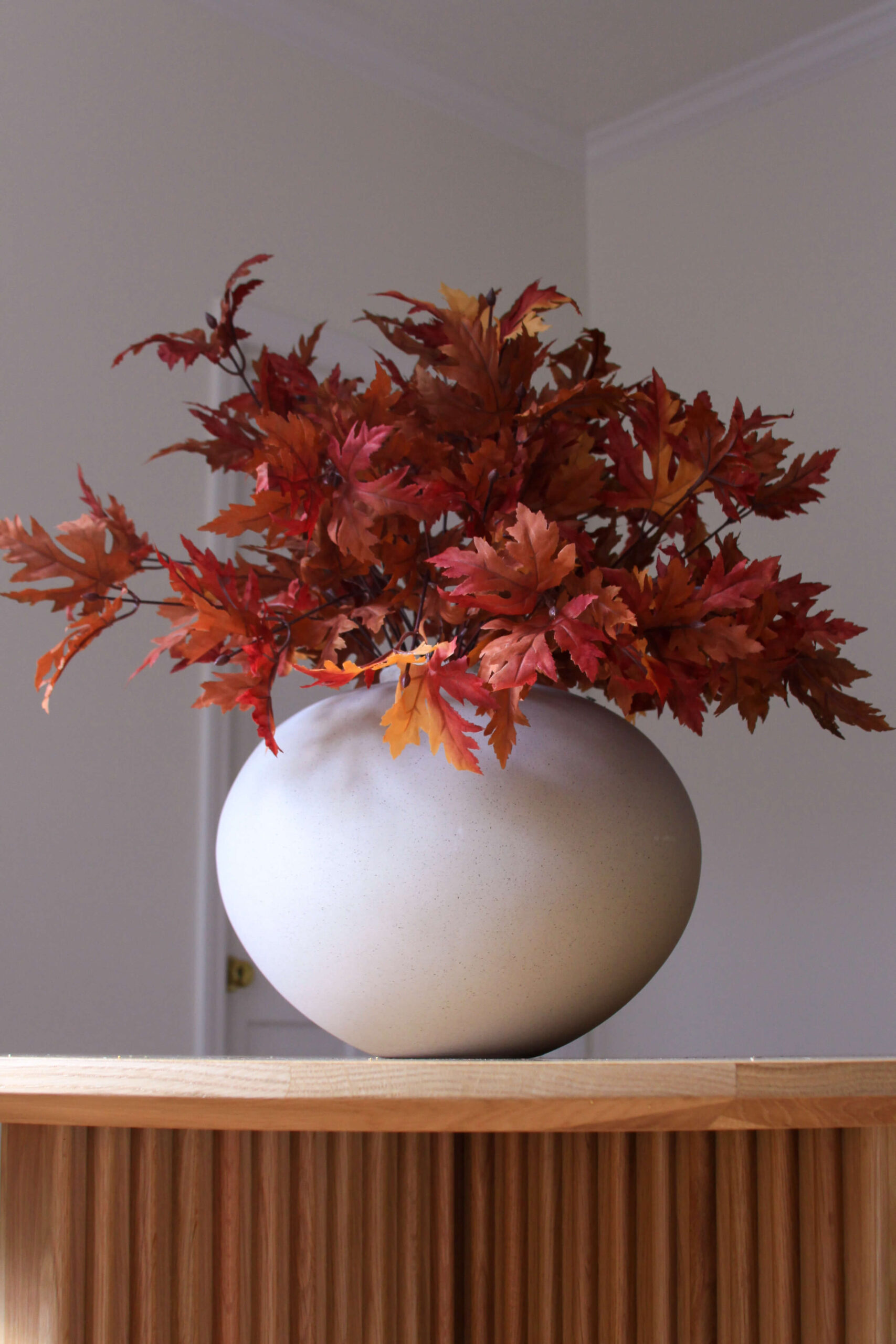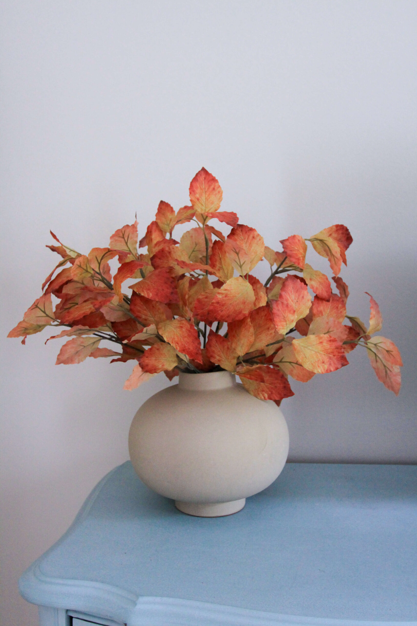 Sources: Crate & Barrel Jimena Round Vase (currently out of stock – similar vase here) | Brown & Burgundy Maple Leafe Bush ( 3 total)