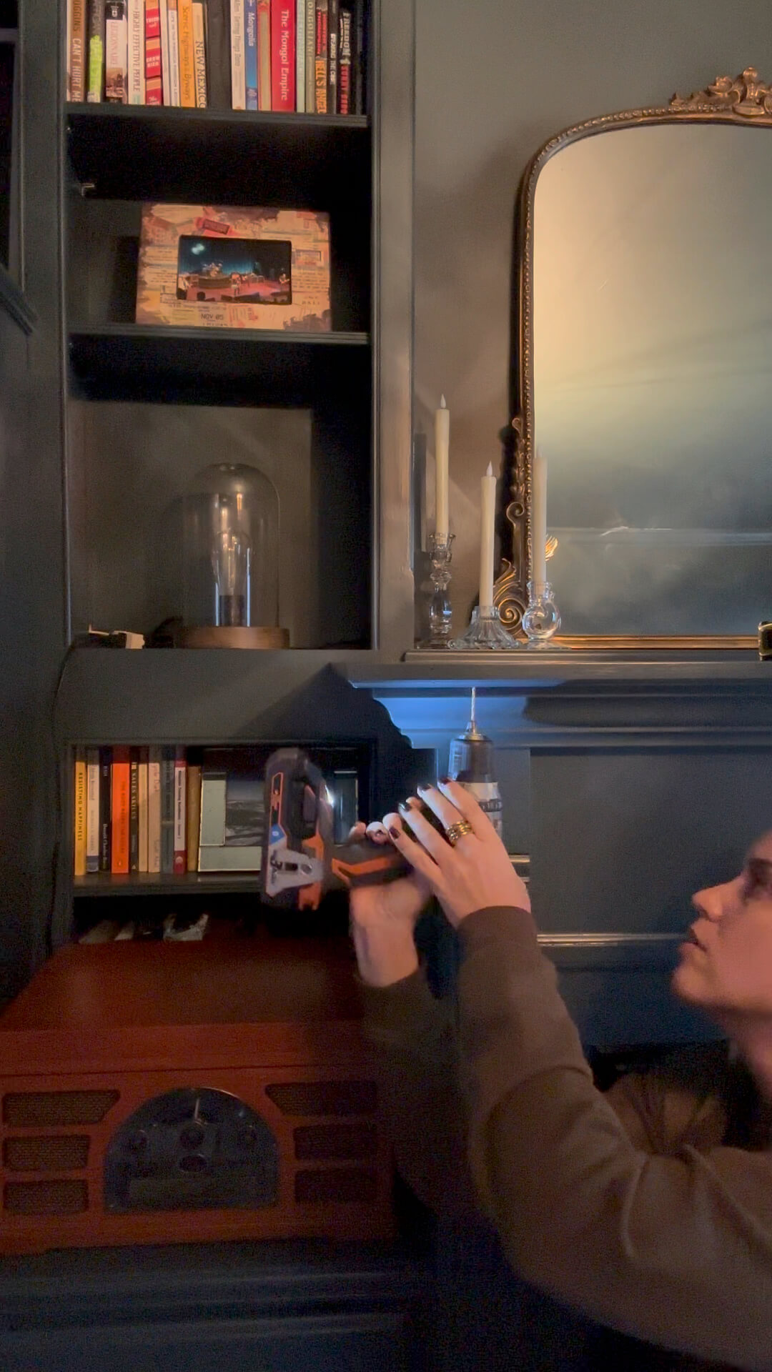 I had so much fun adding in brass accents to really pop against the dark paint. My Primrose mirror that I had in the dining room for years has found its forever home above the mantel and I love seeing the reflection of the gold leaf chandelier. I swapped out the previous desk lamp for a cute little brass task lamp with a curvy arm and was so excited to add my first art lamp above some of my music memorabilia on the back wall. I tend to move my artwork around a lot, so going with a battery powered option felt like a safe choice and I couldn’t be happier with the decision. I’m already thinking about where I can install more of these – (of course I am).