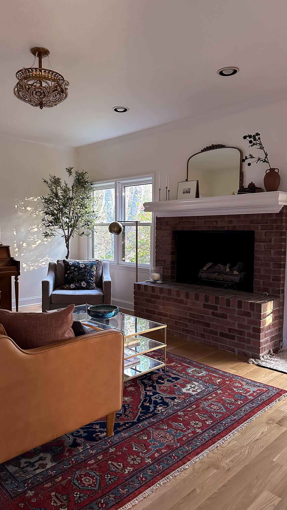 Knowing this room was about to go from day to night, I set out to start building a moodboard with a mix of old and new. The more I started to design, the more excited I became to add in accent pieces that will make the room feel more cohesive, while adding plenty of drama and a touch of masculinity. The centerpiece will be this beautiful gold chandelier, which will really pop against the new dark ceiling. I’ll anchor it by repurposing my Primrose Mirror above the fireplace, and will flank it with candlesticks.