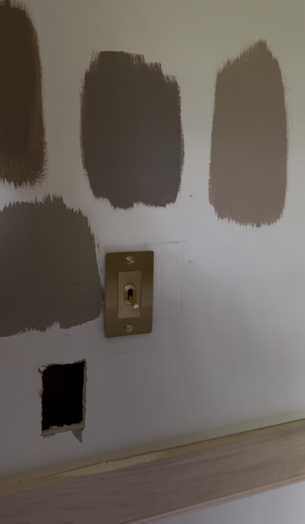 I painted little patches of each color side by side on a strip of baseboard that the sink will eventually go in front of. Both colors looked so similar as I was painting them, however after drying there was a stark difference. And I’m still not sure…
