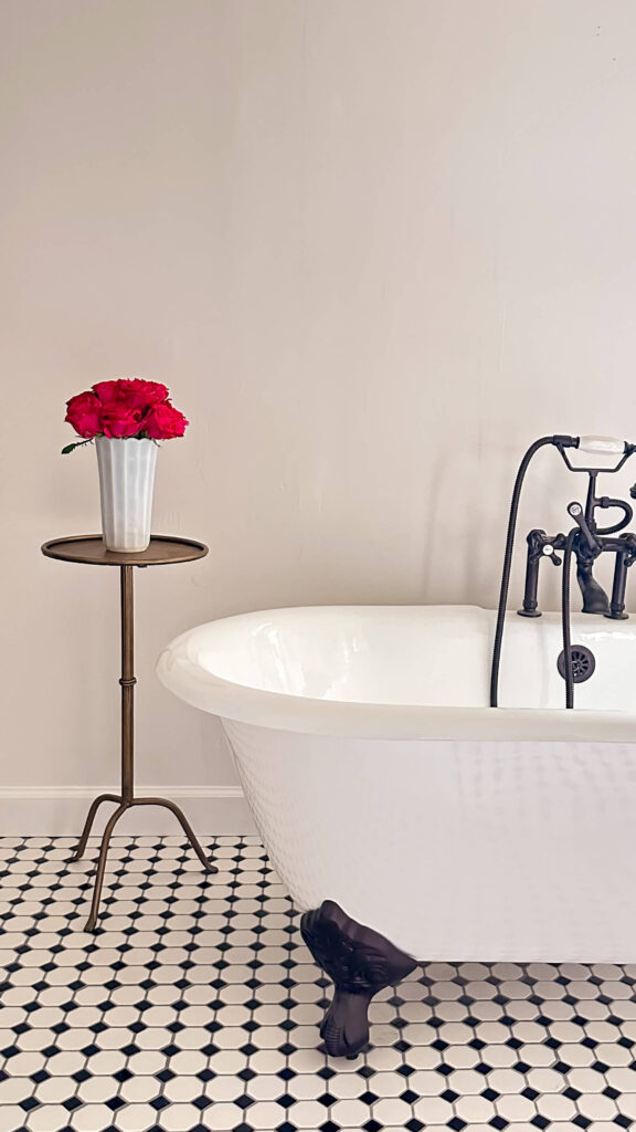 So why have I shared all this? Well recently I was on the hunt for a little side table to put next to my clawfoot tub in the primary bathroom. The Visual Comfort Martini Table I really wanted was a bit out of my price range at $479. However I was determined to recreate the look for less and found a similar option at Home Depot for only $60. The only downside was it was black instead of brass (the brass was indefinitely sold out).