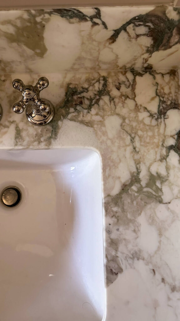 The vanity countertop became a defining design choice. I selected a Calacatta Fiorto marble remnant slab with rich veining in deep green, plum, terracotta, and gold. This natural stone instantly warmed the room and inspired the rest of the palette.