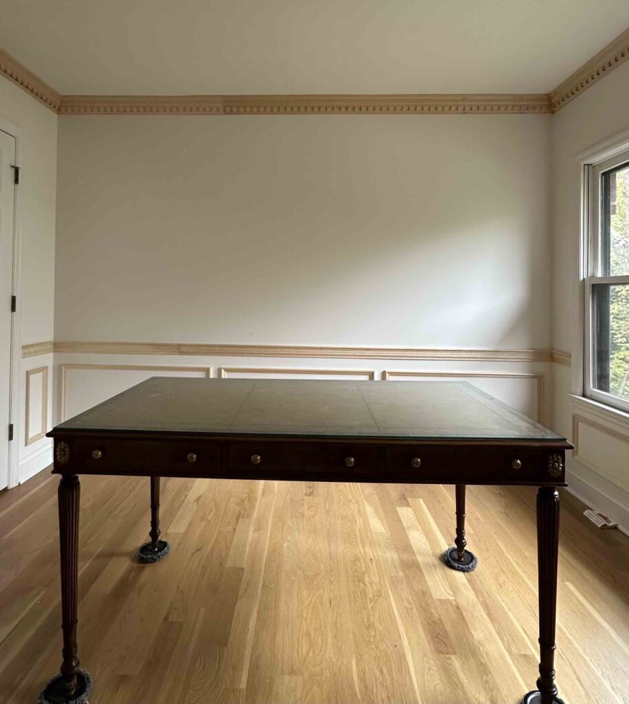 Now that my dental crown molding is up, the next step in my home office makeover is choosing a paint color to go with my new wallpaper choice (see what I picked here). From there, we’ll get to spraying all the trim for a flawless finish.