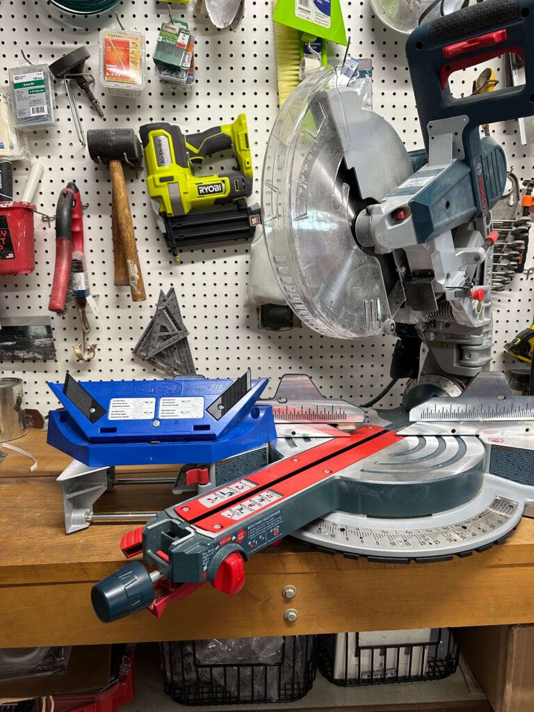 A good miter saw and the Kreg Crown Pro Jig are must haves for this job. I’ve had my Bosch miter saw for several months now and have been very happy with it.