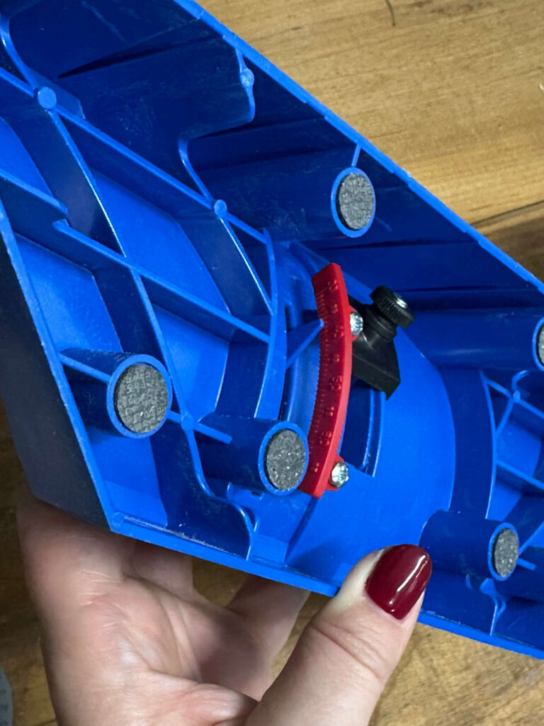 Then on the backside of the Kreg Jig, you’ll see the ability to change the spring angle. Adjust it to the proper angle and tighten the screw. This helps you set your jig correctly so you’re cutting at the proper angle every time.