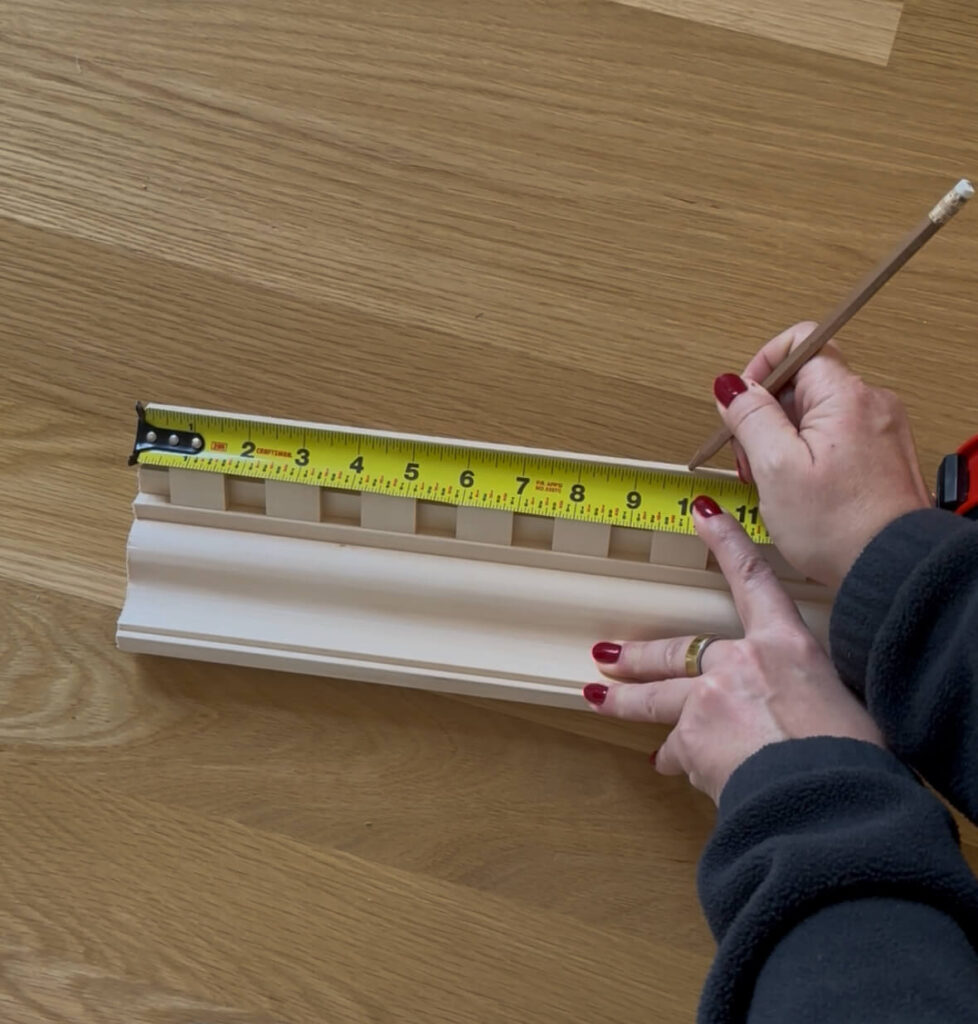 Lastly is measuring and marking the crown the proper way. You want to measure from the corner and then mark this on the bottom piece of your crown molding. See a photo of me doing this below with my dentil molding: the dentil is pointing up and that’s where I’m marking my measurement. This is how we’ll place the crown on the miter saw when we’re ready to cut.